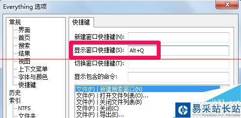 7、那么我們怎么快速調出everything呢?在左側選擇快捷鍵,然后在右側根據自己習慣來設置快捷鍵就好了。這樣我們平時關閉everything,保持電腦界面清爽,等使用的時候按快捷鍵就可以使用了。