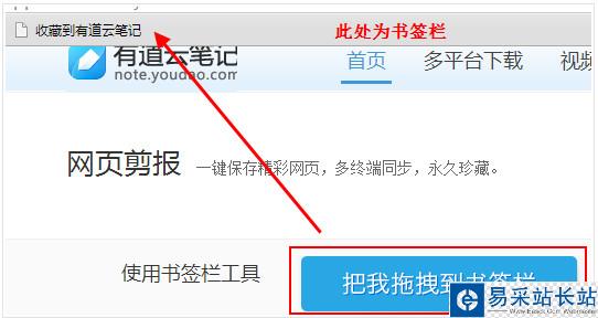 2、登陸了有道云筆記后登陸這個(gè)網(wǎng)站:http://note.youdao.com/web-clipper.html?entry=index&auto=1這是有道云筆記的網(wǎng)頁剪報(bào)收藏欄,我們需要將該鏈接拖到我們的書簽欄中,書簽欄的打開快捷鍵是Ctrl+Shift+B,IE瀏覽器需要在瀏覽器窗口欄空白處點(diǎn)反鍵勾選收藏夾欄,顯示書簽欄后將上面網(wǎng)頁中的藍(lán)色框框按住不放直接拖入書簽欄。
