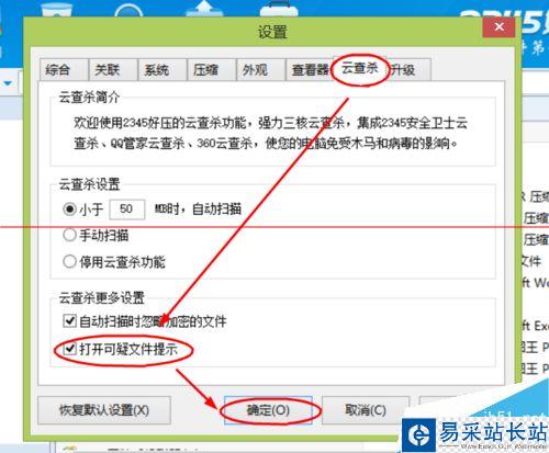 3、在【設(shè)置】界面下,點擊選擇【云查殺】--勾選【打開可疑文件提示】選項--【確定】完成設(shè)置。(如圖所示)