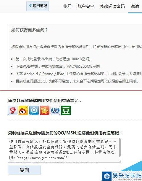 1、在有道云筆記中可以推薦好友去開通使用有道云筆記,一共可以獲得3G空間呢!這個不要錯過!