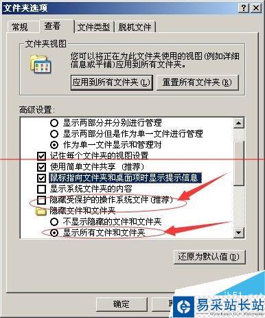 7、然后我們點(diǎn)工具---文件夾選項(xiàng)----按著圖中設(shè)置把隱藏受保護(hù)的操作系統(tǒng)文件前面對(duì)號(hào)去掉,然后把顯示所有文件和文件夾前面這個(gè)圈里面點(diǎn)上點(diǎn)。在確定就可以了。設(shè)置后我們剛才設(shè)置密碼為123456的文件夾中就顯示三個(gè)文件了。
