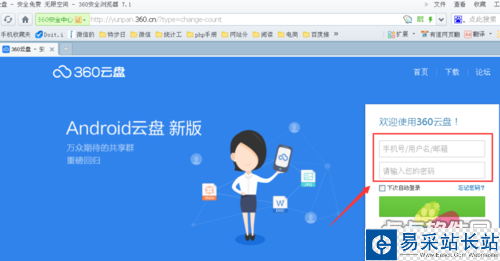 進入到360云盤官網,在右邊登陸框中輸入用戶名,密碼登陸