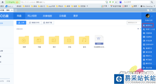 輸入用戶名,密碼后登陸360云盤。找到右上角頭像昵稱的地方,鼠標移上去會彈出一個下拉框,選擇第一個,賬號中心