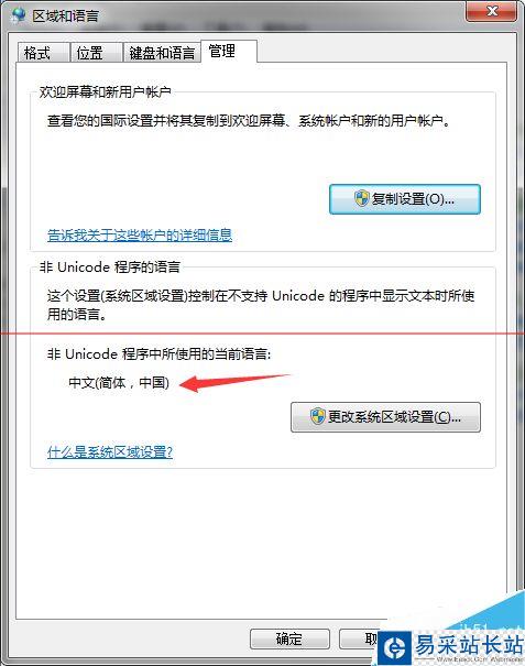 5、在“管理”選項卡會看到在“非Unicode程序語言”下面顯示的是“英語(美國)“,問題就在這里,只要點擊”更改系統區域設置“里面將語言改為”中文(簡體、中國)“就可以了。