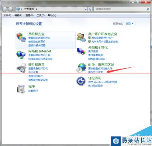 4、點擊”開始”—“控制面板”—“時鐘、語言和區域”—“更改顯示語言”