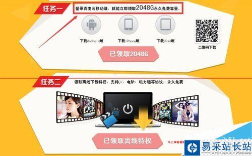 3、用手機掃描二維碼下載安裝移動客戶端,然后登錄手機百度云,即可領取成功。