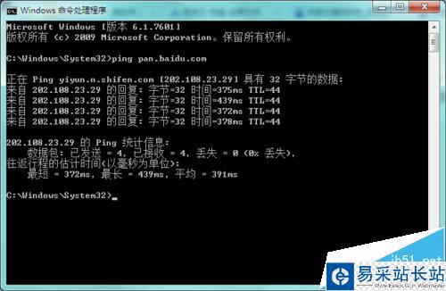 在命令提示符窗口中輸入:ping pan.baidu.com (按回車鍵執行命令),有四組數據及時返回的,屬于網絡正常(故障在電腦方面)。