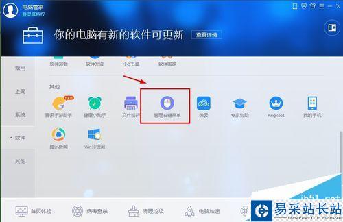 3、在軟件這一項(xiàng)里面找到管理右鍵菜單這一項(xiàng),如下圖位置所示。可能位置跟管家版本有點(diǎn)關(guān)系。
