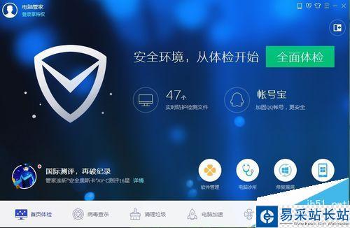 1、打開(kāi)電腦管家首頁(yè),即全面體檢頁(yè),在底部找到一項(xiàng)叫做工具箱的項(xiàng)目,一般位于右下角。