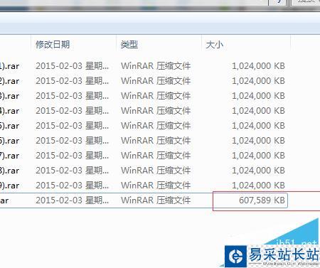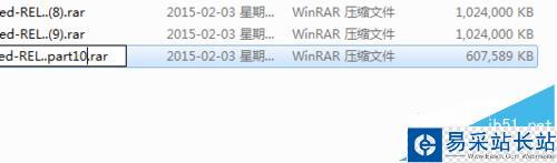 3、將這個容量大小最小的文件名后面加上“.part10”,因為圖中的分卷剛好 10個(序號根據你的分卷數量而定,取最大值,如你有 10個分卷就命名為 part10)