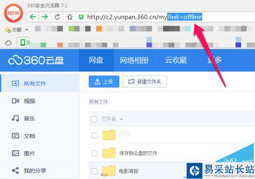 2、接下來我們在瀏覽器的地址欄中,自己360網盤地址的后面添加上“?init=offline”,然后按回車鍵。