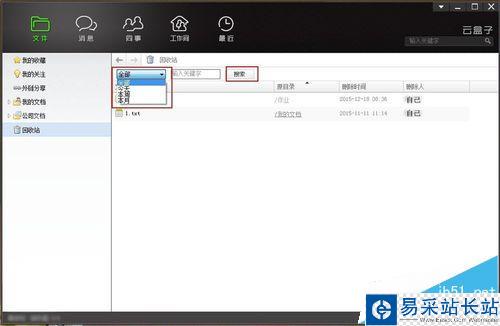 2、我們可以通過文件列表上面的搜索按鈕進行檢索,可選擇刪除時間以及文件名關鍵字進行檢索(這里的文件只要不去徹底刪除會永久保存)。