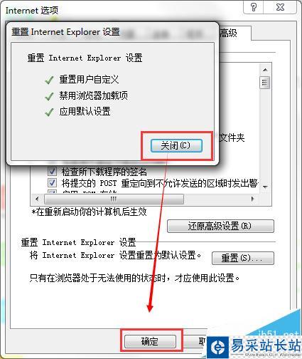6、重置完成后點擊【關閉】按鈕關閉重置對話框,點擊【確定】退出【Internet選項】對話框
