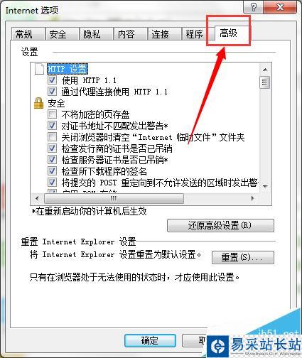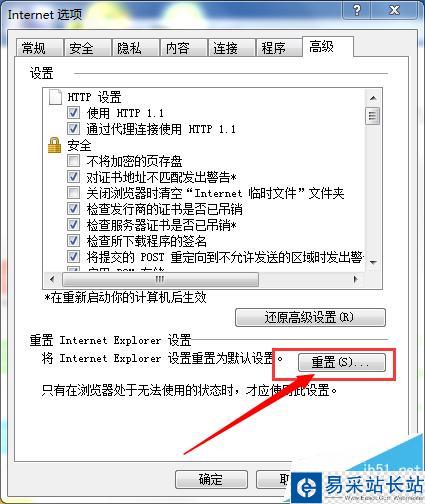 4、在【高級】界面中點擊“將Internet Explorer設置重置為默認設置”右邊的【重置】選項按鈕,如圖所示