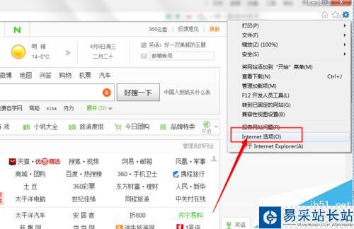 2、進入IE瀏覽器后點擊頁面右上方齒輪形狀的設置圖標,接著會彈出下拉菜單選項,選擇【Internet選項】,如圖所示