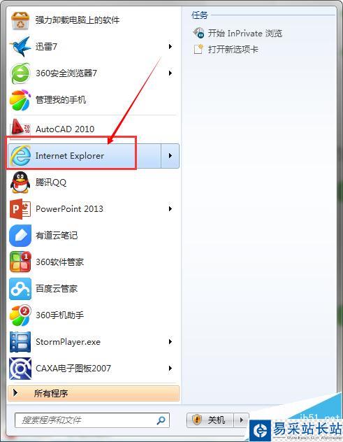 1、首先打開在開始菜單中打開IE瀏覽器,如圖所示