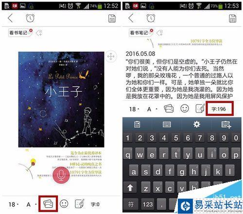 4、圖文筆記中圖片是可以隨時插入文字中的。先點擊下方圖片按鈕,選擇手機本地相冊里的圖片,可以選擇一張或多張圖片。插入圖片后,就可以鍵入文字了,字號和字體顏色可以任選。如果你需要控制篇幅,工具欄的自動字數統計會很方便。