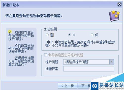 點擊下一步后,進入了設置加密級別好密碼保護提示問題的設置步驟,如果沒有特殊要求,此處使用eDiarymore的加密級別即可。