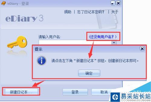 在eDiary登錄界面中,要求輸入用戶名密碼,但是如果是第一次登陸eDiary電子日記的話,是沒有eDiary的用戶名密碼的。點擊還沒有用戶?eDiary會彈出來點擊左下角“新建日記本”annual,創建新日記本即可的提示。