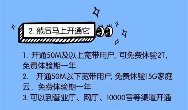 2、開通50M及以上寬帶用戶,可免費體驗2TB,體驗期一年;50M以下寬帶用戶,免費體驗15GB,體驗期同樣是一年。(可通過營業(yè)廳、網(wǎng)廳、10000等渠道開通)