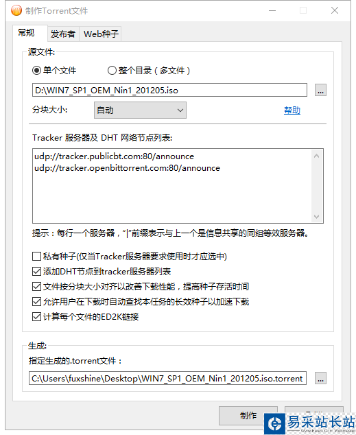 在彈出窗口中,按著要求選擇源文件后,等待生成種子文件即可。生成torrent文件的路徑用默認的或自定義修改后的都行,圖省事直接將“種子”丟桌面即可。