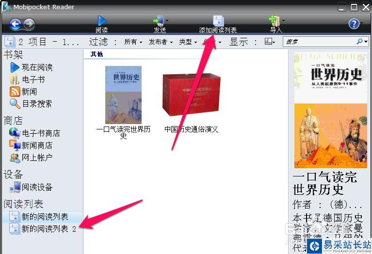 書太多的話,最好分分類。我們?cè)谏戏近c(diǎn)擊“添加閱讀列表”,左下方就多出了一個(gè)列表,你可以給它重命名。