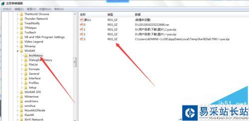 6、在彈出的注冊表編輯器中,打開HKEY_CURRENT_USER/Software/WinRAR/ArcHistory分支。
