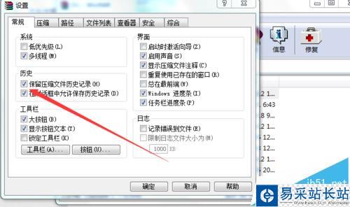 4、在彈出的設置對話框中點擊“常規”選項卡,把歷史下面兩個勾選的去掉,默認是打鉤的。去掉勾選后單機確定即可。以后winrar都不會保留使用文件記錄了。