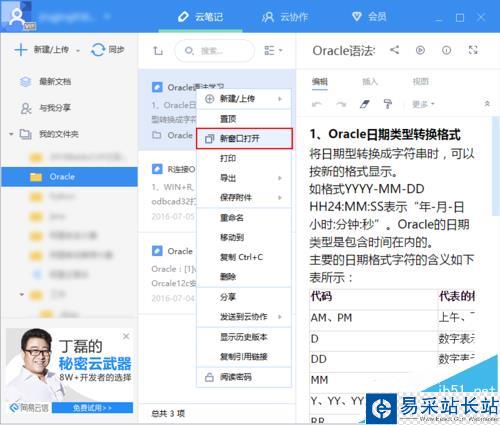 我們在使用有道云筆記時,有時候需要像打開兩個word將兩篇筆記并排放置在屏幕兩側,方便瀏覽和編輯,本經驗就介紹如何在有道云筆記中實現該操作假設我們要打開文件夾Oracle中的前兩篇筆記,實現并排編輯。