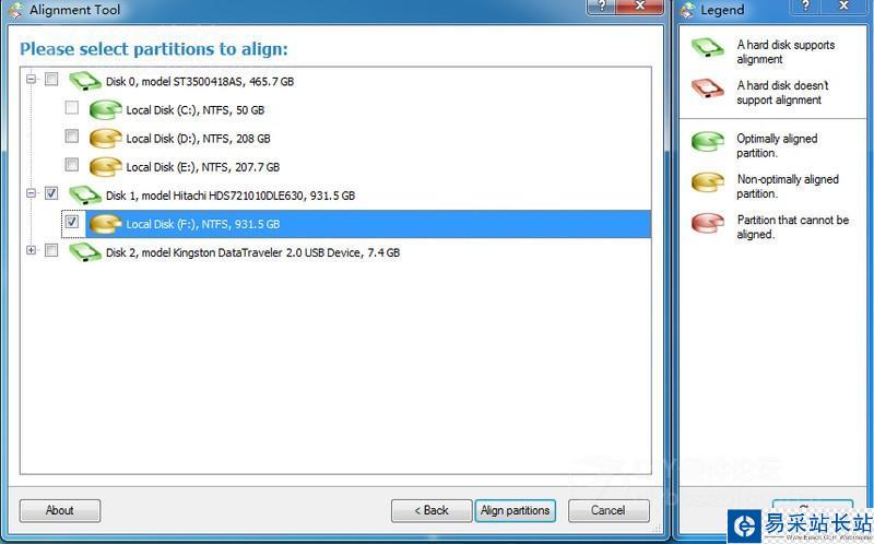 3、可以看到左側(cè)是你的硬盤(pán),而右側(cè),則是說(shuō)明,如果顯示綠色,則是已經(jīng)對(duì)齊4K,而顯示黃色,則是可以對(duì)齊4K,但未對(duì)齊,而粉紅色的,則是不支持高級(jí)格式化,也就是對(duì)齊4K也沒(méi)用。選擇黃色未對(duì)齊的硬盤(pán),勾選上,然后點(diǎn)下面的Align Partitons