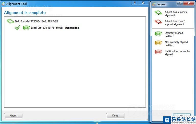 6、對(duì)齊后,電腦會(huì)自動(dòng)重啟,然后進(jìn)入系統(tǒng)后,會(huì)彈出下圖的窗口,可以看到,分區(qū)的圖標(biāo)已經(jīng)變成了綠色,而后面有一個(gè)Succeeded成功的標(biāo)識(shí),現(xiàn)在硬盤(pán)的4K就對(duì)齊了。