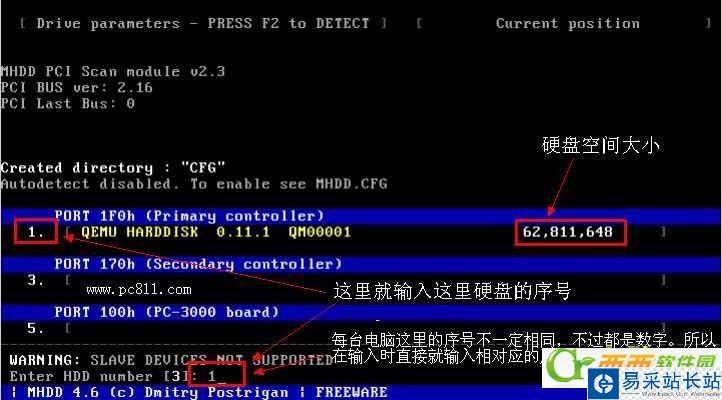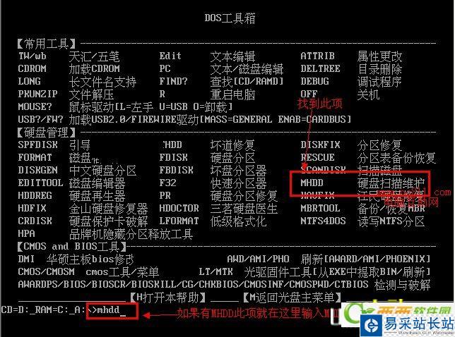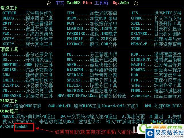 第3步:進入DOS工具箱之后,輸入“MHDD”并回車確定執行此磁盤掃描工具。(大小寫均可)