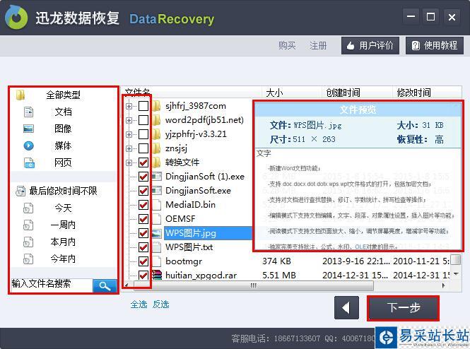 第五步:掃描結束后,迅龍數據恢復軟件會將搜索到的文件整理并列出,因為文件比較多,可通過軟件提供的方法來搜索文件,也可以通過文件預覽來找到需要恢復的文件。迅龍數據恢復軟件支持文檔、圖片等文件的預覽,用戶選擇需要恢復的文件進入下一步即可。如下圖所示: