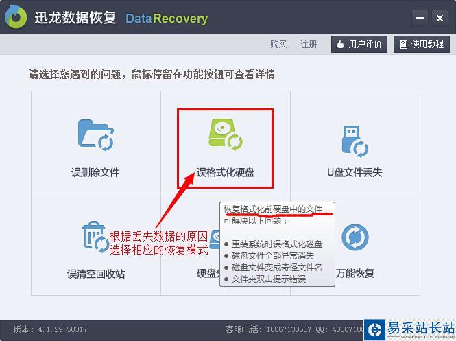 第二步:迅龍數據恢復軟件有六種恢復模式,用戶可以根據需求選擇相應的恢復模式,這里我們應該選擇“誤格式化硬盤”恢復模式,軟件自動進入下一步,下圖所示: