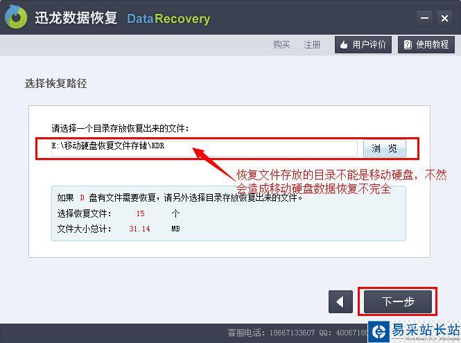 第六步:根據軟件提示,為需要恢復的文件設置存儲位置。存儲位置空余空間一定要比移動硬盤恢復文件大,且不能是格式化的移動硬盤。