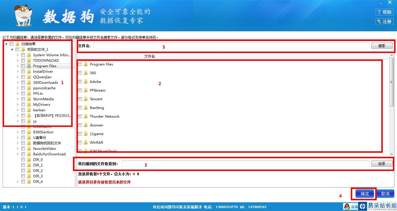 第四步:待掃描完成后,軟件自動進入“恢復(fù)文件選擇界面”,如下圖所示。如果您想要恢復(fù)移動硬盤里的所有資料,那么請在區(qū)域1內(nèi)的菜單欄中選中所有文件夾;如果您只需要恢復(fù)移動硬盤里的部分資料,您可以在區(qū)域1內(nèi)選中您需要恢復(fù)的文件原存放的文件夾,然后再區(qū)域2內(nèi)找到并選中您需要恢復(fù)的文件,您也可以嘗試使用區(qū)域5內(nèi)的搜索功能,直接將您需要的文件顯示在區(qū)域2內(nèi)。找到您需要的文件后,單擊文件名還可以對文件進行預(yù)覽。接著,在區(qū)域3內(nèi)選擇文件恢復(fù)后的保存路徑,為保證恢復(fù)成功,請勿將恢復(fù)數(shù)據(jù)的保存位置設(shè)置為您格式化的移動硬盤。完成上述步驟后點擊區(qū)域5內(nèi)的確定。