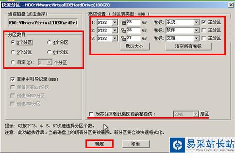 6、在彈出的分區屬性界面,左側可以設置分區數目,右側上方可以設置分區屬性,下方可以設置硬盤4K對齊“u啟動u盤啟動盤進行固態硬盤4k對齊使用教程”,再點擊“確定”按鈕