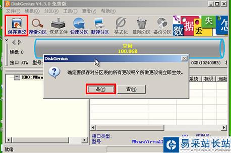 4、使用上面的方法把剩余的分區也刪除,當整個硬盤都為空閑狀態時點擊左上方的“保存更改”按鈕,在彈出的提示窗口中點擊“是”按鈕、