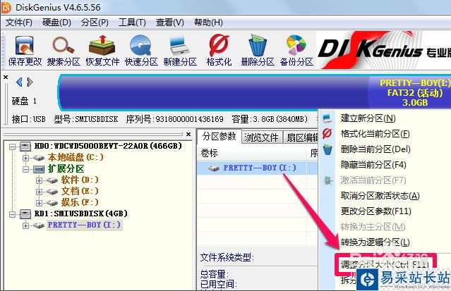5、diskgenius保存更改完成后右鍵單擊想要合并分區的盤符,點擊調整分區大小
