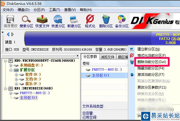 2、對硬盤進行合并和分區操作前最好先備份文件,右鍵單擊其中一個分區,然后選擇刪除當前分區