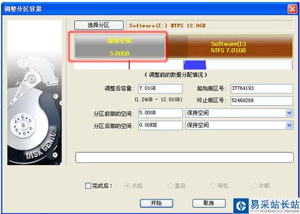 2、調整分區大小時,DiskGenius支持鼠標操作,可以用鼠標改變分區大小,移動分區位置,切換調整后空間的處理選項等;也可以直接指定調整后的分區大小,對于有特殊要求的用戶,還可以設置準確的起始與終止扇區號,如下圖: