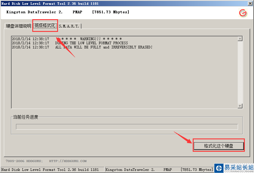 第二步:切換界面到“低級格式化”項下,點擊“格式化這個設備”(注:無需勾選“執行快速擦除”)如下圖所示