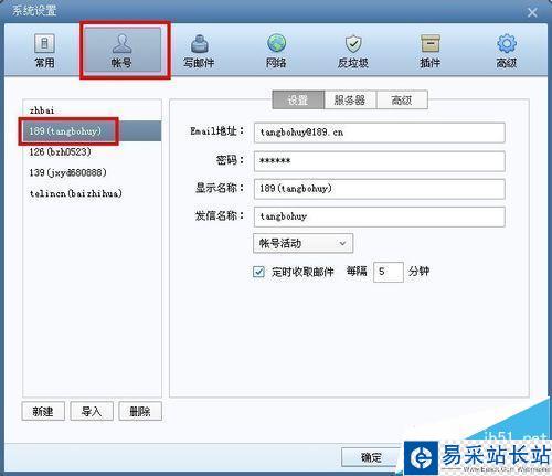 2、點(diǎn)擊賬號(hào)管理后,標(biāo)題顯示系統(tǒng)設(shè)置,我們選擇賬號(hào)選項(xiàng)卡,然后再點(diǎn)擊需要備份的賬號(hào),我們隨便選擇一個(gè)189郵箱,在右邊可以看到定時(shí)收取,我們也可以選擇手動(dòng)收取。