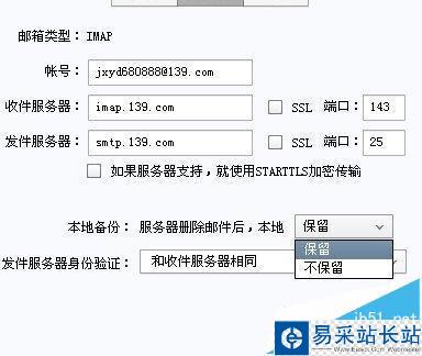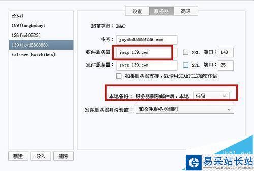4、那么我們?cè)賮?lái)看下別的郵箱139郵箱,接收服務(wù)器是imap,這里有個(gè)本地備份選項(xiàng),服務(wù)器刪除,可以選擇保留在本地,也可以不保留。