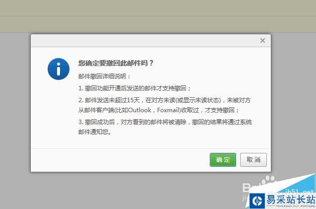 6、在滿足以上條件的情況下,才有可能撤回郵件,然后點擊確定,結果將以郵件的形式通知你。如果撤回成功,將會受到以下提示: