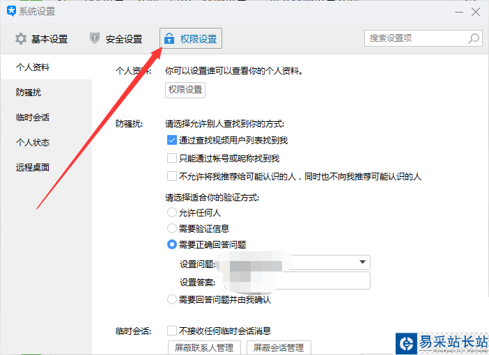 3、在權限設置界面選擇“防騷擾”設置,進入防騷擾設置界面。