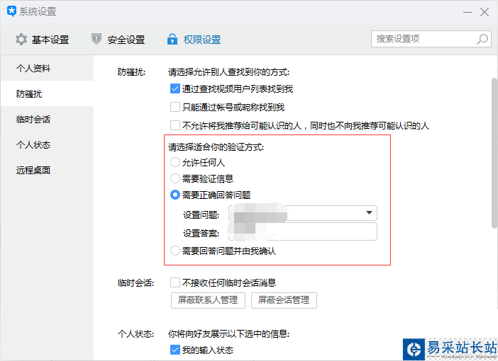 5、選擇適合的驗證方式:其中分為允許任何人、需要驗證信息、需要正確回答問題、需要回答問題及由我確認四種方式。