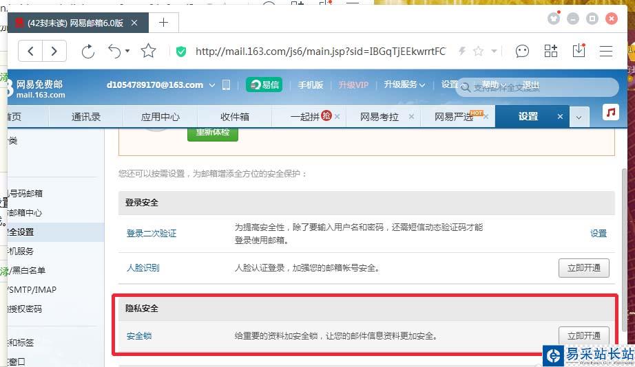 點擊設置——郵箱安全設置——安全鎖——開啟;獲取手機驗證碼——完成驗證——開啟密保,如圖: