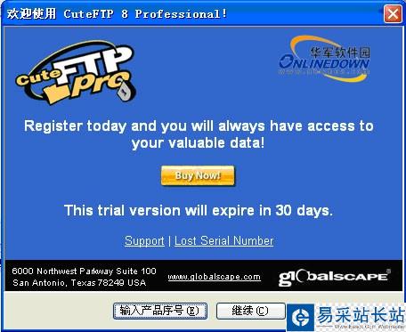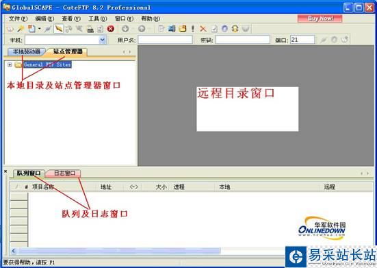 CuteFtp Pro8.2含有簡體中文語言包, 通過菜單【工具】—>【全局選項】可以進行語言設(shè)置。試用版期限為30天。主界面默認顯示了本地驅(qū)動器(目錄)、站點管理器、隊列及日志四大窗口。