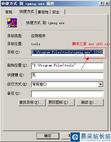 其實對于此錯我是這樣解決的:在快捷方式中的‘屬性’中的‘目標’的路徑后加上你想綁定的端口號,我是改為:"C:/Documents and Settings/Administrator/桌面/軟件/ipmsg.exe" 12345 其中12345是我想綁定的端口號,有一問題是使用該軟件的雙方應該使用同一端口,即兩人都改成同一端口號。